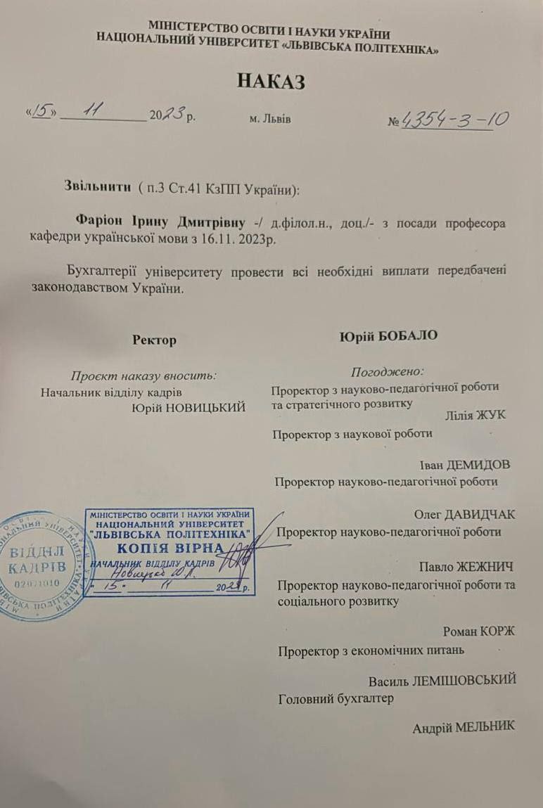 Наказ про звільнення погодив ректор Львівської політехніки Юрій Бобало.