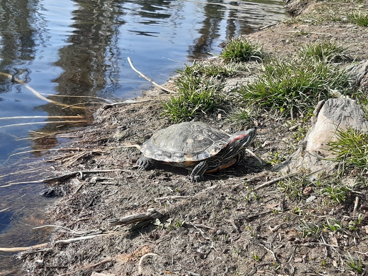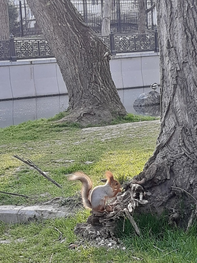 На фото зображена червоновуха черепаха, яка вибралася з водойми погрітися на весняному сонці, а також білка, яку не турбують відвідувачі парку.