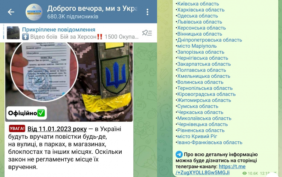 Адже, обравши, наприклад, Волинську область, користувачу потрібно підписатися на новий телеграм-канал "Доброго вечора, ми з Луцька". Після того, як адмін дає дозвіл на приєднання, обіцяної інформації про "список місць, де вручають повістки" там просто немає.
