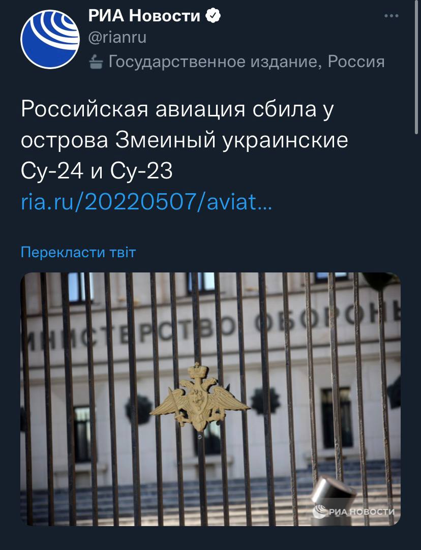 Після заяви ЗСУ про знищення на острові Зміїний десантного судна окупантів та двох ЗРК "Тор" , Міноборони країни-агресора придумало фейк про нібито знищення в районі острова одразу п'яти повітряних суден та кількох безпілотників української армії.