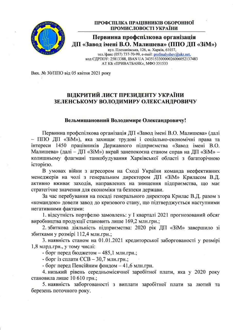 Глава профспілки танкового заводу імені Малишева нагадав, що на адресу ДК "Укроборонпром" було направлено вимогу розірвати трудовий договір з гендиректором підприємства Василем Криласом. Однак, у двотижневий строк її не було виконано, тому профспілка змушений звернутися з цього приводу до суду.