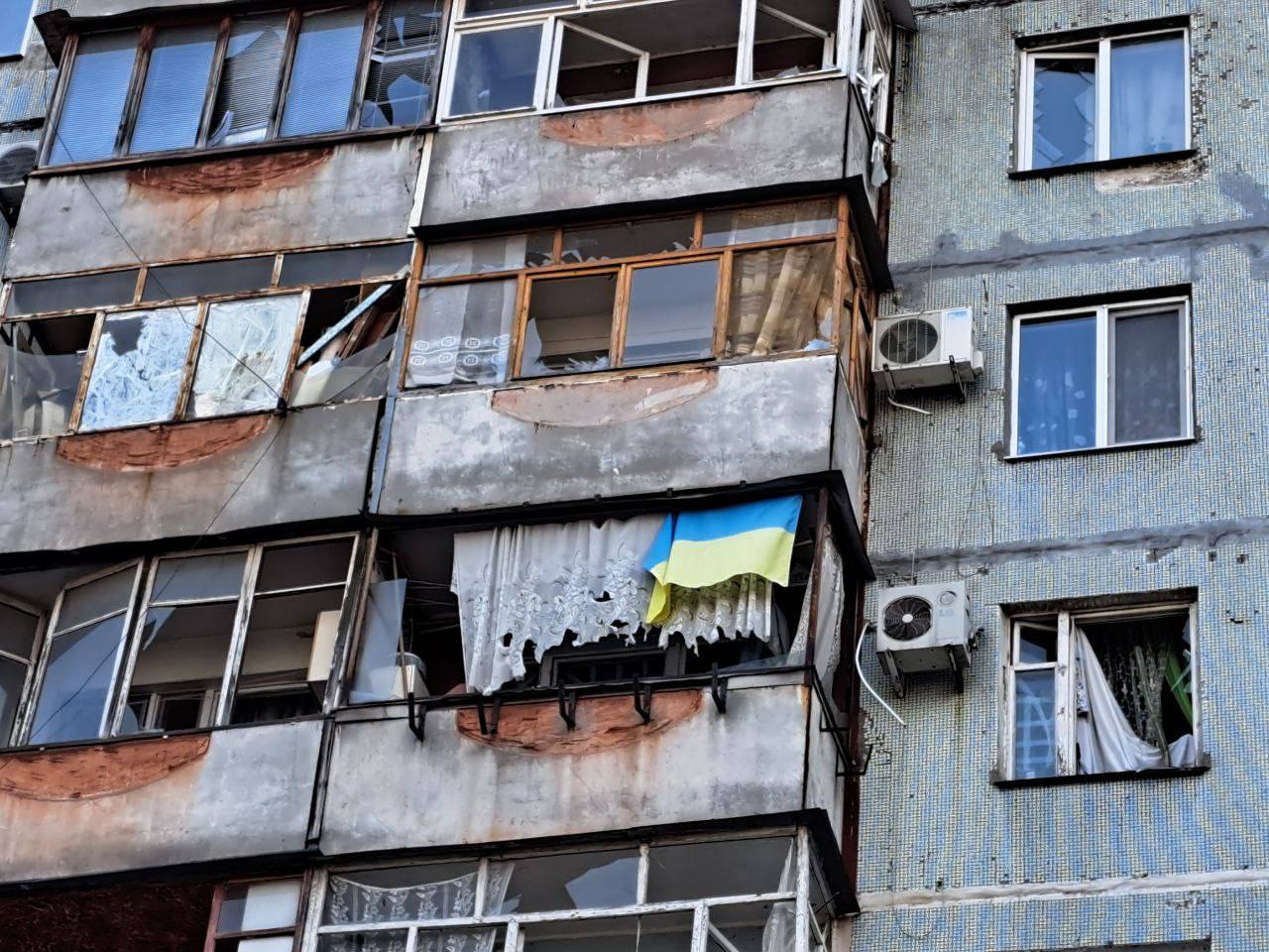 Після обстрілів у багатьох квартирах було вибито скло та зруйновано балкони. Але на одному з балконів продовжував висіти державний прапор України як символ стійкості та незламності.
