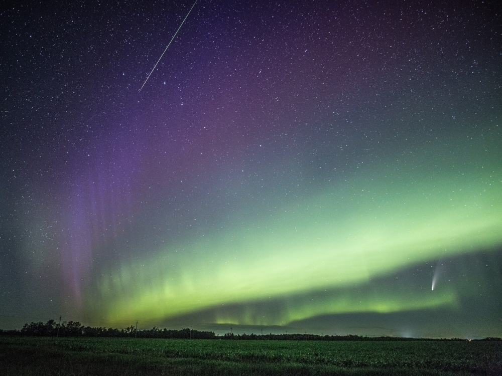 Фотографу Донні Лах, вночі 14 липня, біля своєї ферми в Манітобі (Канада), вдалося зробити унікальний знімок - вона відобразила на одному кадрі комету, метеор і полярне сяйво.