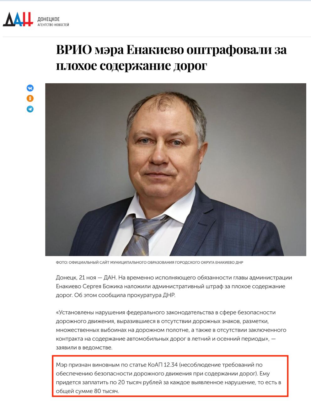 "Гауляйтера Єнакієвого (мером його ніхто не вибирав) оштрафували на 80 тисяч рублів за погані дороги в місті", - написав він.