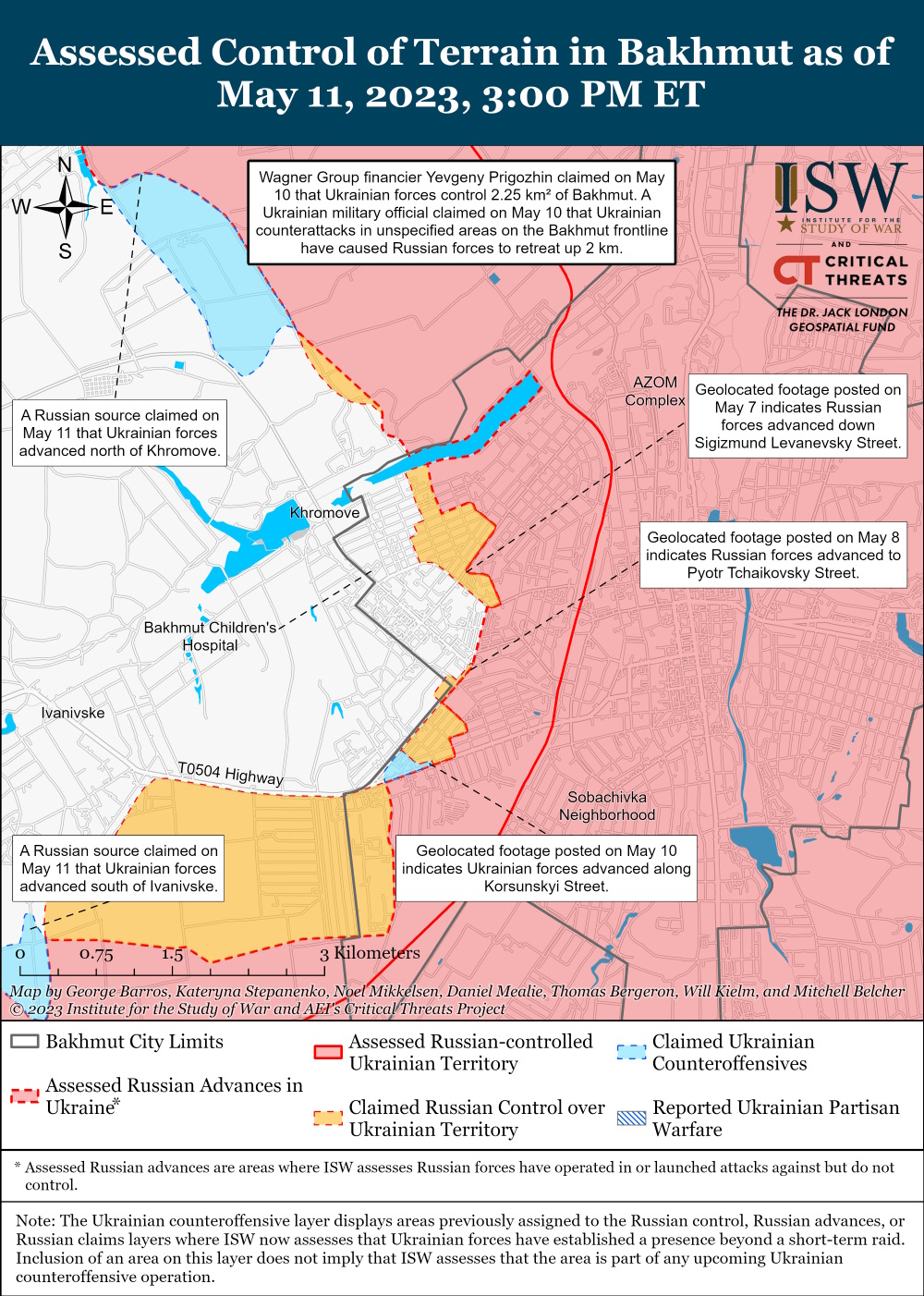 Успішні локалізовані українські контратаки стримували російські наступальні зусилля в Бахмуті. Загалом 11 травня російські війська здійснили 15 наземних атак у Бахмуті та поблизу Ступочок (13 км на південний захід від Бахмута), що є помітним зменшенням кількості атак.