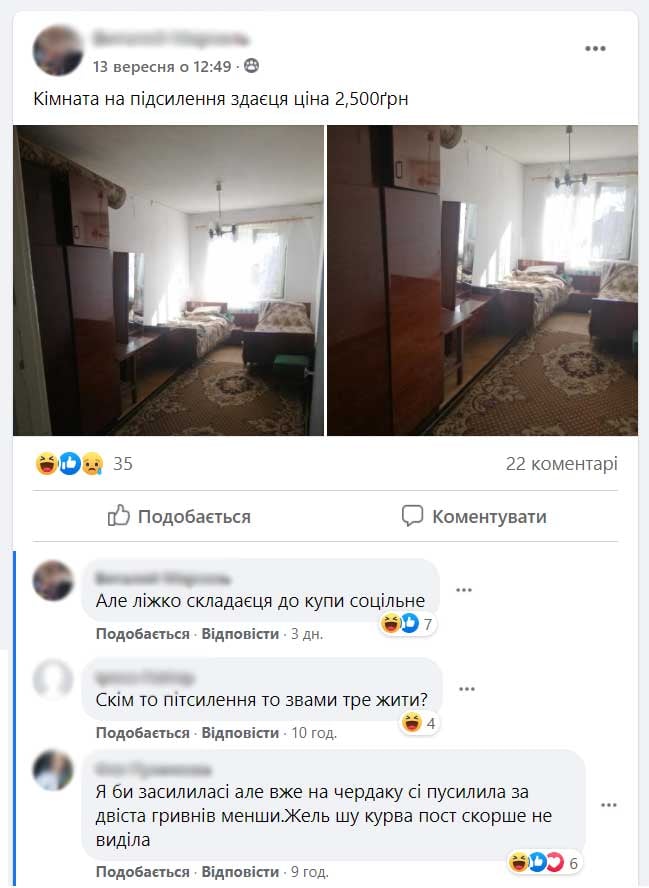 Під постом коментатори почали жартувати про кімнату і саме оголошення. Деяких здивувала ціна за житло, яку визначив господар квартири - 2 500 гривень. Судячи з фото, кімната давно потребує ремонту.