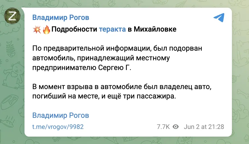 У серпні минулого року в тимчасово окупованому селищі Михайлівка Запорізької області підірвався автомобіль місцевого гауляйтера Івана Сушка, а сьогодні ввечері, 2 червня невідомі патріоти ліквідували ще одного колаборанта-підприємця Сергія Дідоводюка, який одним із перших прийшов до військових РФ після того, як вони зайняли населений пункт.