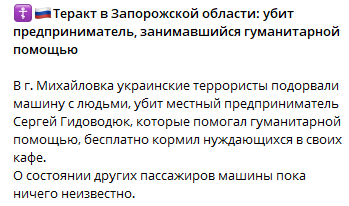 Z-паблики вже оплакують "Сергія Гідоводюка", який "допомагав гуманітарною допомогою і безкоштовно годував нужденних у своїх кафе".