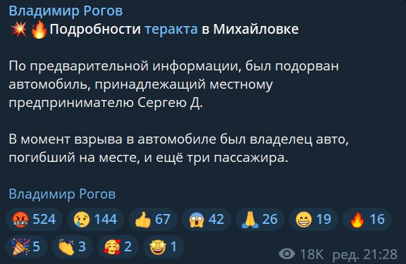"Збиралися відпочити в місцевому кафе, але трохи не дісталися – авто з чотирма шанувальниками Кремля злетіло у повітря прямо біля пункту призначення. Уточнюємо інформацію, хто вижив, а хто відпочине вже на концерті Кобзона", – написав він.