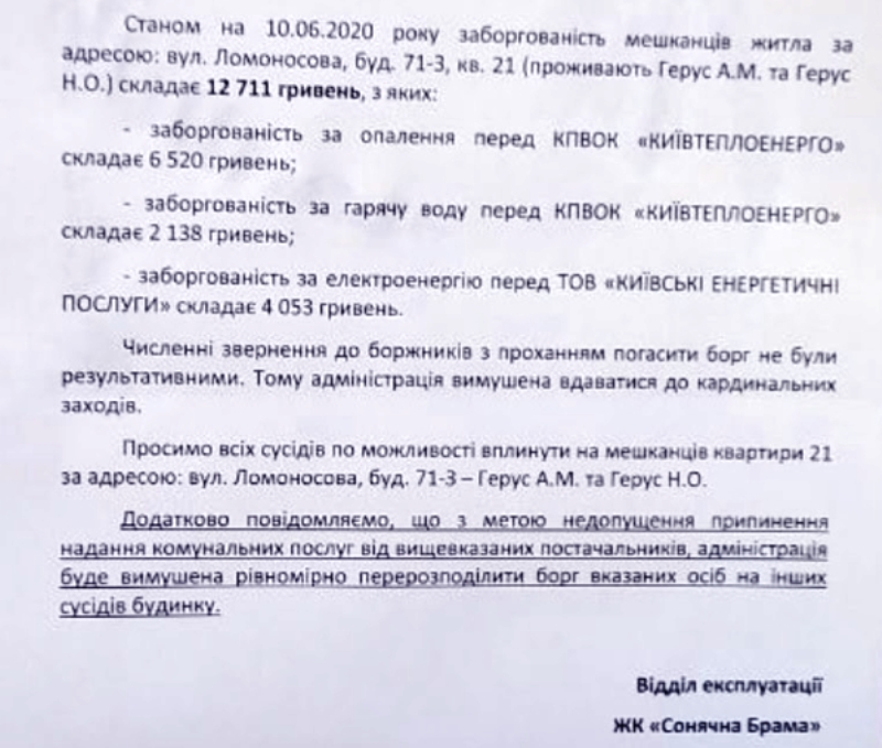 Як випливає з тексту оголошення, адміністрація ЖК просить мешканців вплинути на сім'ю Геруса щоб погасити заборгованість. В іншому випадку, борг Геруса може бути розподілений між усіма мешканцями багатоквартирного будинку.