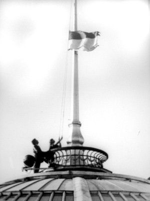 Люди, що були під будівлею Ради, ледь не штурмували її, коли біля українського прапору побачили прапор УРСР. Тисячі громадян кричали "Ганьба!" та прорвали кордон міліції. Після цього червоно-синій прапор УРСР спустили, про що жестами пояснив мітингувальникам народний депутат Дмитро Павличко з вікна другого поверху ВР.