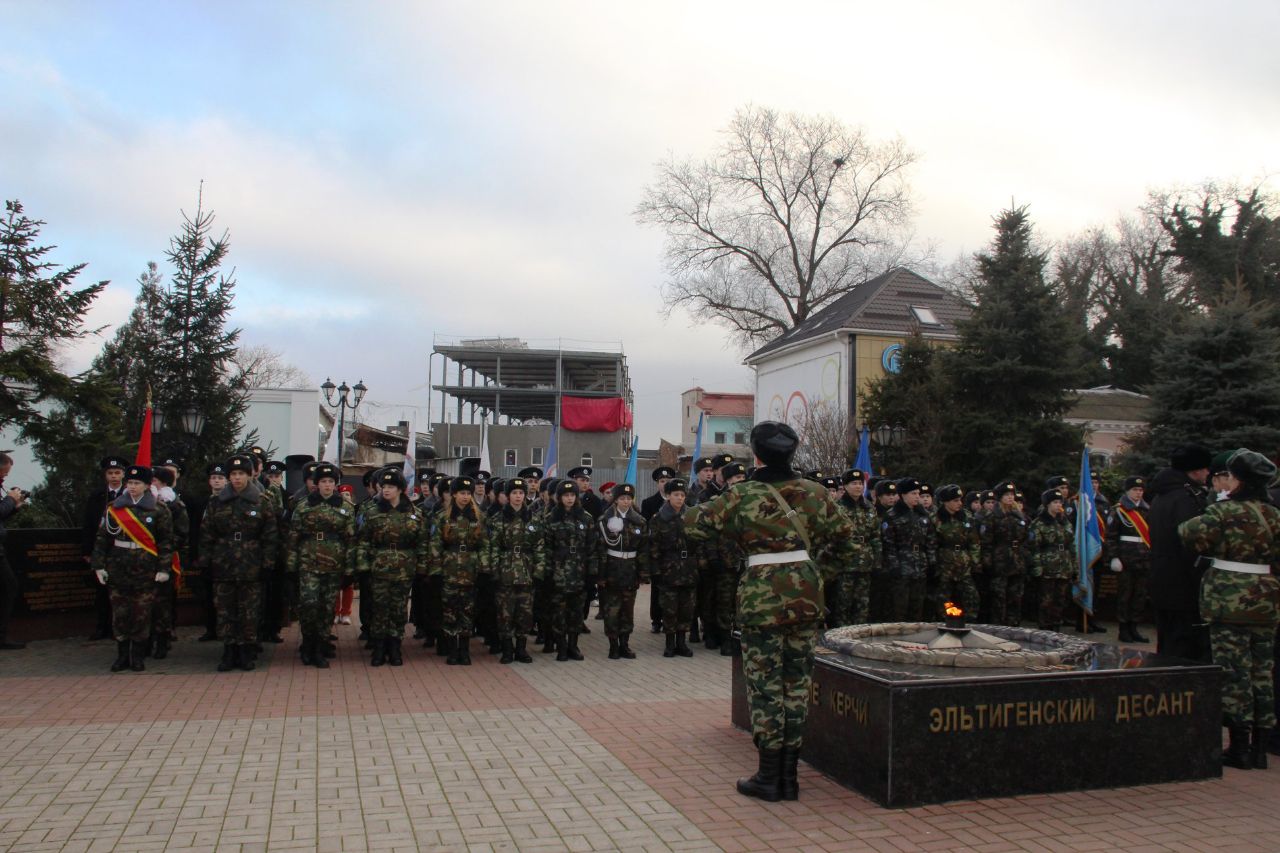 На фото видно, як підлітків, вдягнених у військовий камуфляж, змушують шикуватися та стояти у почесній варті біля пам'ятного знаку боям за Аджимушкайські каменоломні - підземні каменоломні в межах міста Керч, де з другої половини травня до кінця жовтня 1942 року частина військ Кримського фронту вела оборону проти німецьких військ.