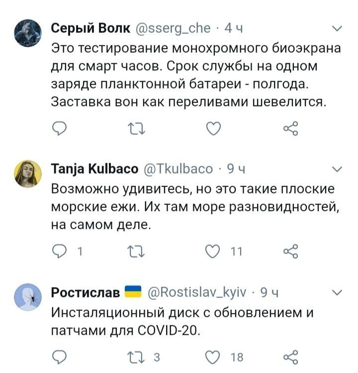 "Южногваделупскій біологічно активний асфальт", "Це розумний асфальт, що самозатягується. Але одна дуже розумна дірка втекла", "Піщаний долар", цими черепашками будуть платити зарплати в збанкрутілих диктатури - Куба, Венесуела, Росія ... "," Плоский щитоподібний морський їжак ", - пишуть коментатори.