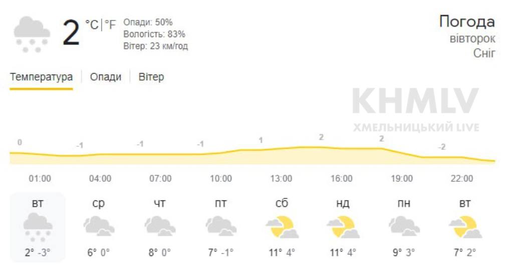 За повідомленнями, сьогодні в Хмельницькому прогнозують хмарність, а у першій половині дня пройде сніг, котрий до вечора перейде в сніг з дощем. Температура на день сягатиме 2 градусів тепла.