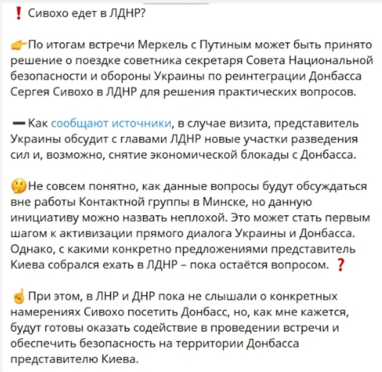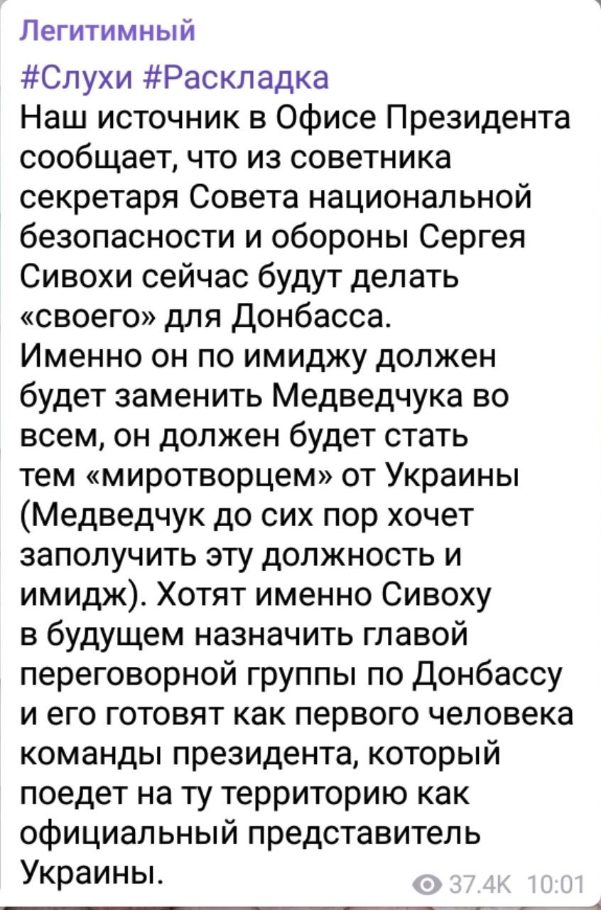За інформацією джерела в Офісі президента, на яке посилається Telegram-канал, невдовзі Сивохо може поїхати на окупований Донбас із першим офіційним візитом як легітимний представник. Нібито, навіть планує там зустрітися із ватажком донецьких бойовиків Денисом Пушиліним. У майбутньому екс-коміка можуть призначити навіть головою переговорної групи з питань тимчасово окупованих територій.