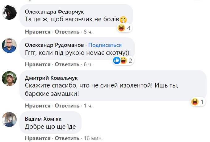 Коментатори під дописом зауважили, що "спасибі, що не синьою ізоляційною стрічкою".