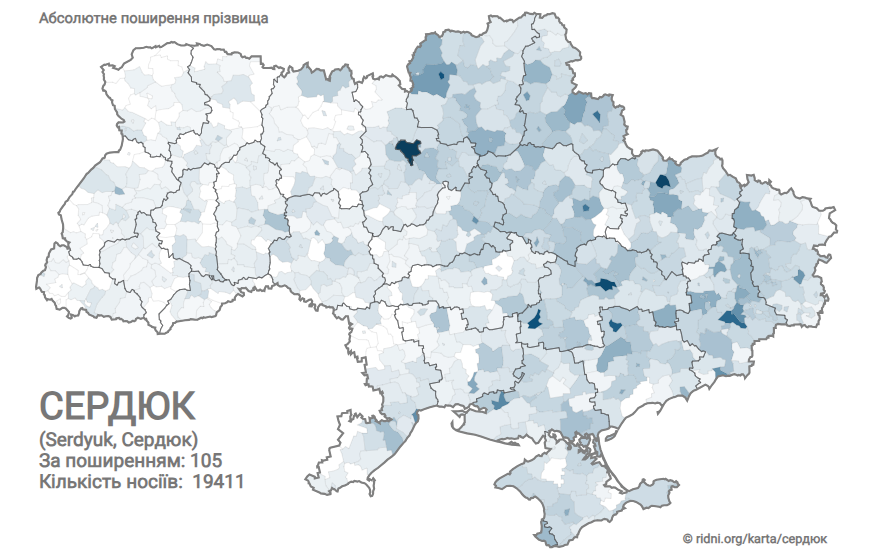Прізвище Сердюк налічує 19411 носіїв й за поширенням займає 105 місце.