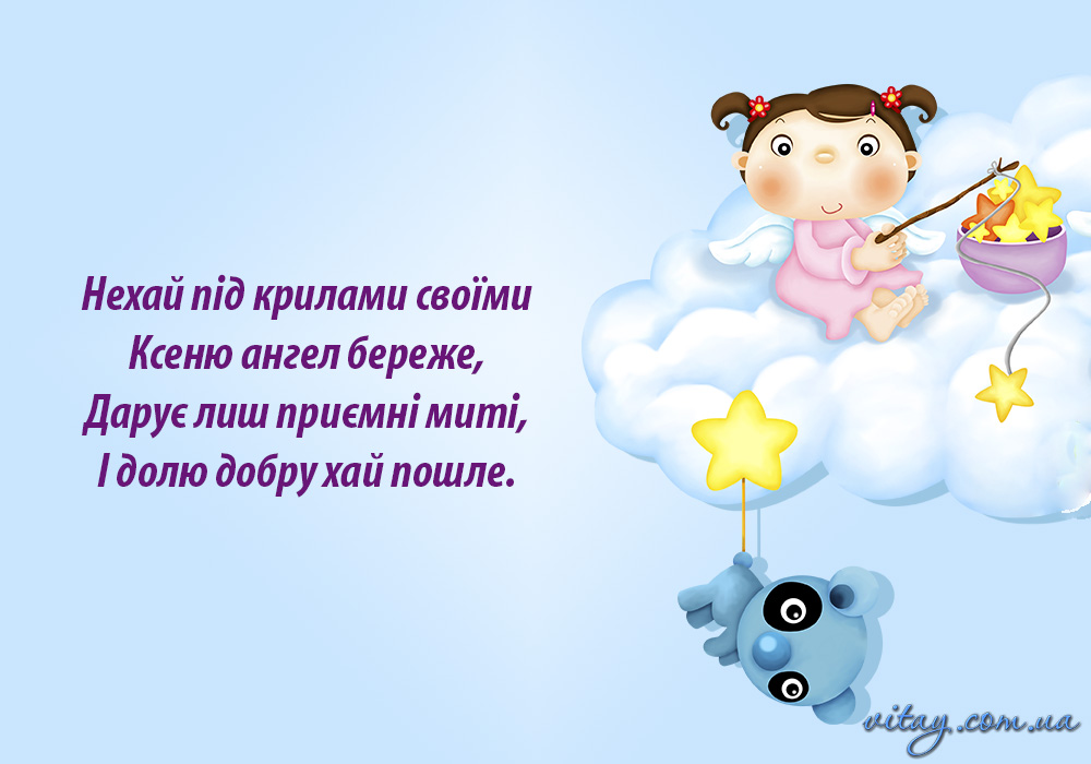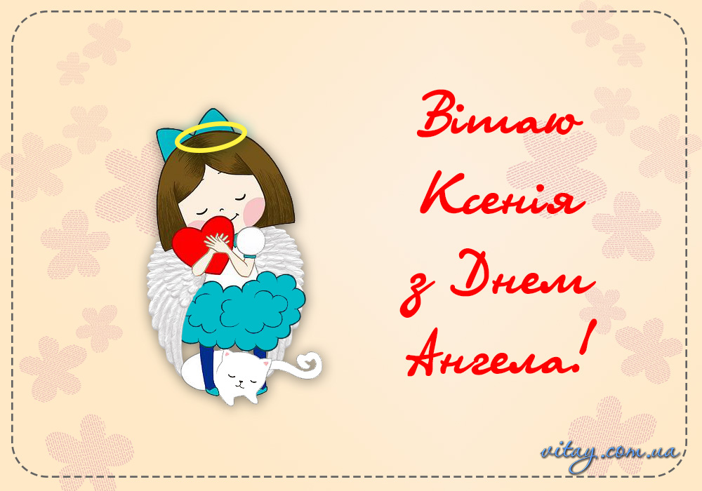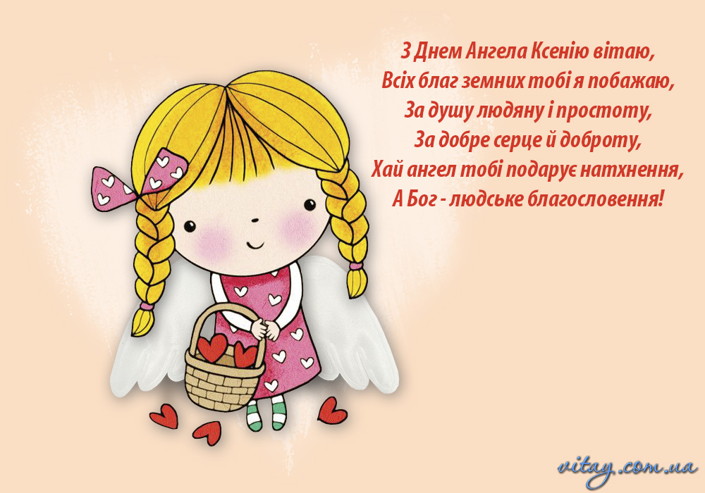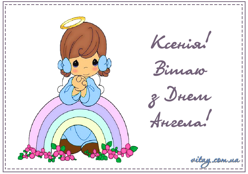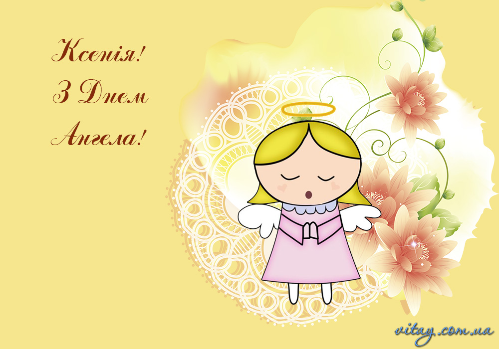 Дорога Ксенія. Вітаю з Днем Ангела! Бажаю тобі яскравих фарб в житті, чарівного щастя і щирого кохання, доброї казки і світлої надії, безсумнівного щастя і везіння. Хай твій ангел охоронець завжди буде поруч з тобою і вберігає від всіх негараздів.