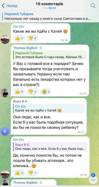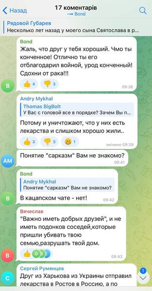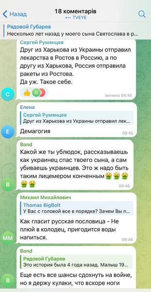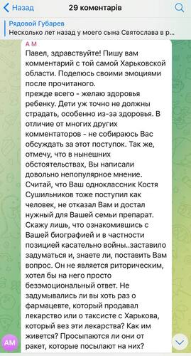 Також під дописом колаборанта відреагував користувач з Харківської області поцікавився, чи задумувався Губарєв про те, як живеться тим людям, що фігурують в його історії, зокрема, фармацевту, що продав ліки, і таксисту, що віз препарат у Бєлгород: