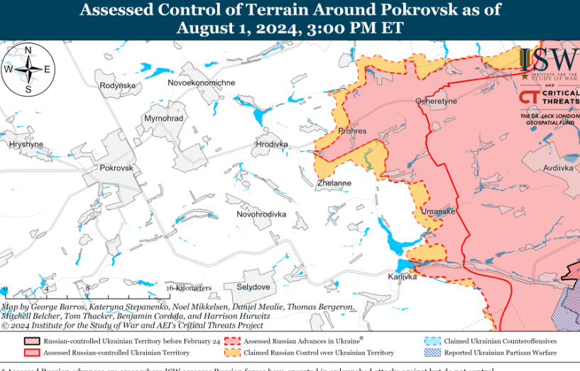 У звіті згадують заяву українського військового оглядача - Костянтин Машовець зазначив, що українські захисники на Покровському напрямку мають гірше обладнання та засоби захисту, тому наразі не в змозі сповільнити просування російських військ.