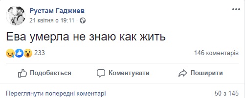 "У мене немає ілюзій, що мені хтось щось винен, я не прошу грошей або безкоштовний квиток. Я купив квитки, але вже два рейси з ОАЕ скасували - на 25.04 і 28.04. Я прошу!!! Благаю!!! Будь ласка, допоможіть, потрапити в Україну. Я готовий пішки йти, будь-які можливості підійдуть. Допоможіть, будь ласка, попрощатися з моєї Євою ", - написав Гаджієв.