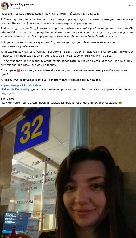 "За дві години в черзі не помітила жодної агресії чи обурення "поганим УЗ" абощо. Всі втомлені, але з розумінням. Чемненько в чергах. Навіть коли дві людини переді мною зачинили віконце на 10хв перерви, тупо жодного обурення не було. Спокійно чекали... Продають квитки на найближчі дві доби і не далі, нагадую нагадування УЗ", - повідомила журналістка.