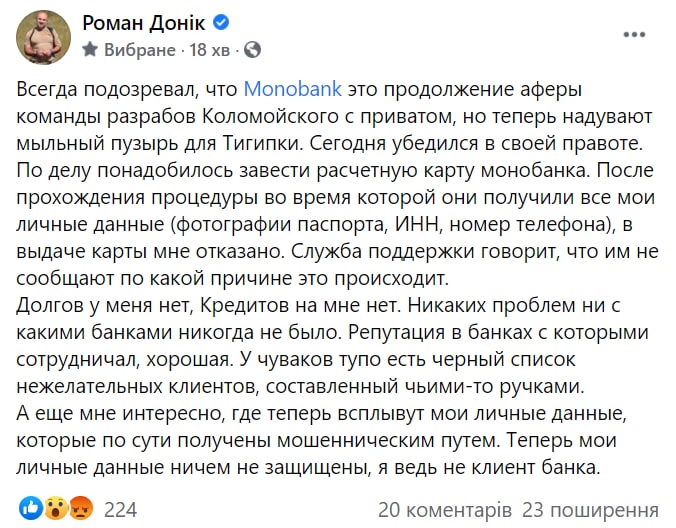"У чуваків тупо є чорний список небажаних клієнтів, складений чиїмись ручками. А ще мені цікаво, де тепер спливуть мої особисті дані, які по суті отримані шахрайським шляхом. Тепер мої дані нічим не захищені, я ж не клієнт банку", - пише Роман Донік.