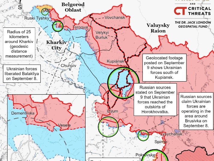 Крім того, на думку укладачів звіту, українські військові просунулися на північ від Грушівки, продовжуючи напрям у бік логістичного вузла ворога у Великому Бурлуці на північному сході Харківщини.