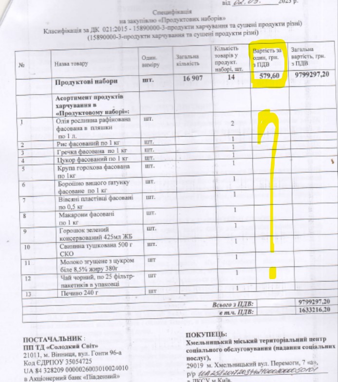 Перевагу надали компанії, яка запропонувала дорожчу ціну. Замовник, Хмельницький міський територіальний центр соціального обслуговування, уклав угоду з ПП "ТД "Солодкий світ". Вартість угоди - 9,8 млн грн, що тільки на 2% нижче від очікуваної вартості замовника.