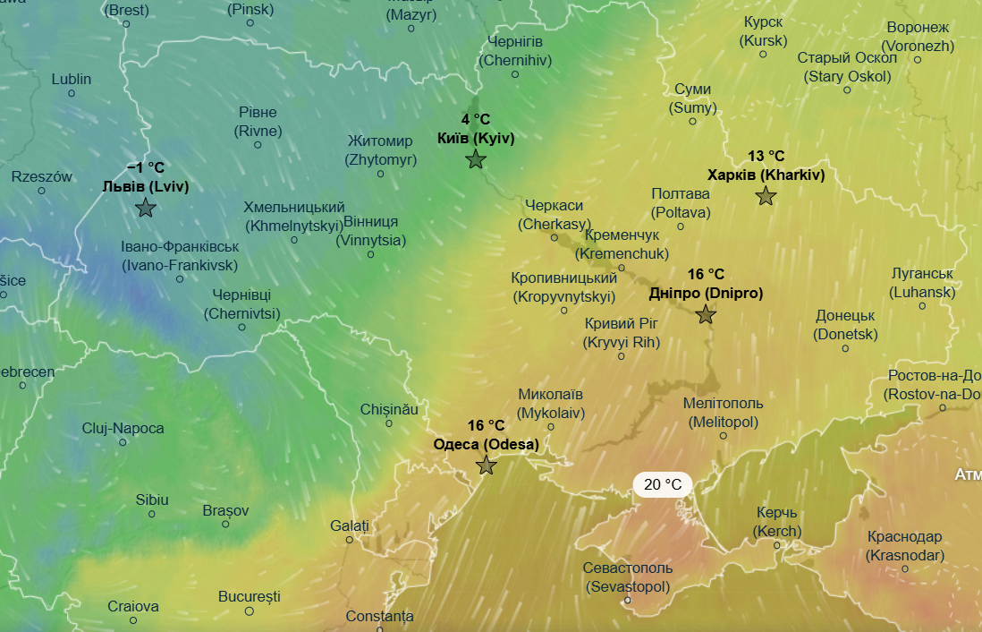 У четвер, 20 листопада, синоптична ситуація в Україні буде схожою до попередньої доби. Нічні морози посиляться до -3...-4 градусів в північних областях, а впродовж доби термометри піднімуться до максимальної позначки +5...+8 градусів.