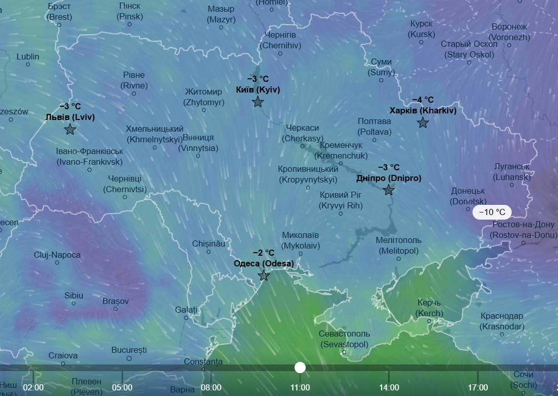 В ніч на 1 січня в західних, північних, центральних та південних областях України очікується від -1 до -3 градусів, сильніші морози вдарять на Сумщині, Харківщині та Полтавщині - до -8 градусів. А от на Луганщині та Донеччині буде справжня зима з тріскучими морозами до -18... -20 градусів.
