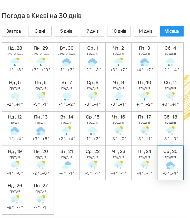 У Києві погода в цей день буде похмурою, температура повітря вночі становитиме -8° C , а вдень – -4° C. Вологість становитиме 75%, швидкість вітру становитиме 2, 78 м/с.