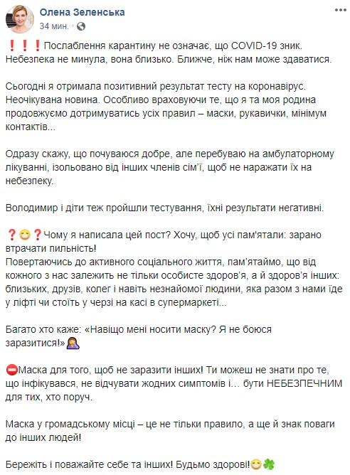 "Сьогодні я отримала позитивний результат тесту на коронавірус. Неочікувана новина. Особливо враховуючи те, що я та моя родина продовжуємо дотримуватись усіх правил – маски, рукавички, мінімум контактів...", - написала вона.