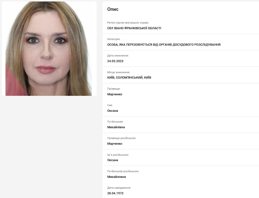 Колишню телеведучу, дружину проросійського політика Віктора Медведчука, підозрюваного у держзраді, Оксану Марченко оголосили в розшук. Вона переховується від органів досудового розслідування.