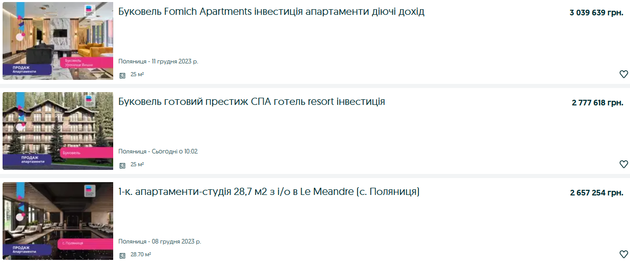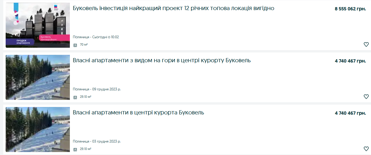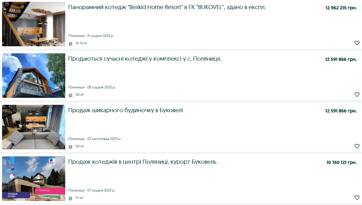 Водночас вартість котеджів у Буковелі теж різниться. Є варіанти за 25,92 млн грн і за 10,7 млн грн.