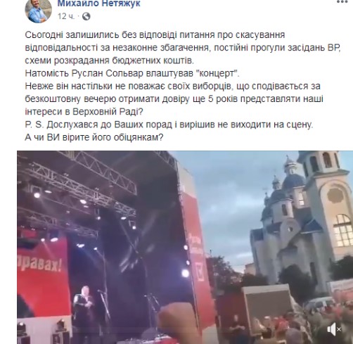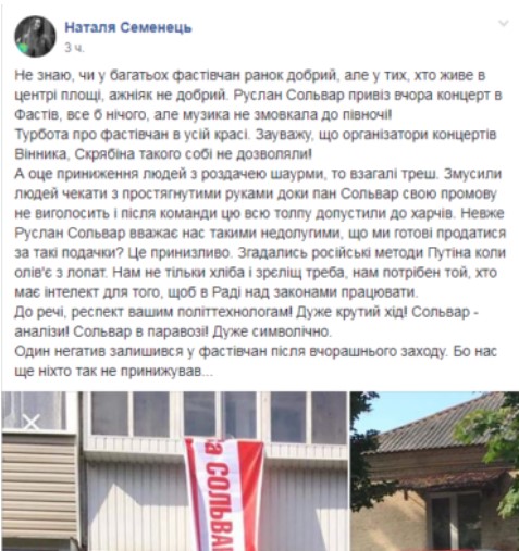 Концерт, який Руслан Сольвар організував для агітації, приніс зовсім несподівані реакції. Людей обурила занадто гучна музика, а також роздача шаурми - на думку деяких городян це був принизливий захід.