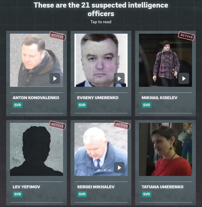 Так, у журналістському розслідуванні озвучуються кілька десятків імен російських дипломатів, які співпрацюють із розвідкою РФ. Виявлені дипломатичні представники є чинними співробітниками Служби зовнішньої розвідки, Головного розвідувального управління та ФСБ. Всі вони працювали як персонал дипломатичних місій і призначалися на другорядні посади.