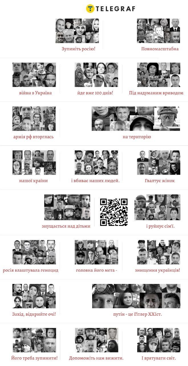 Сайт видання "Телеграф" перетворився на одну велику обкладинку, з якої на читача дивляться 200 пар очей загиблих українців. За кожним з них унікальна історія життя, яке передчасно обірвалось через спробу Кремля насадити в Україні свій "русскій мір".
