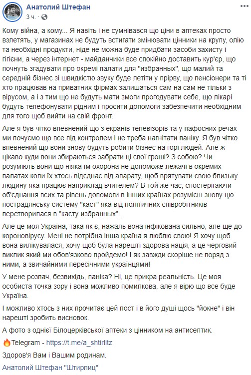 "У мене розпач, безвихідь, паніка? Ні, це прикра реальність. Це моя особиста точка зору і вона можливо помилкова, але я вірю що все буде Україна. І можливо хтось з них прочитає цей пост і в його душі щось "йокне" і він нарешті зробить висновок. А фото з однієї Білоцерківської аптеки з цінником на антисептик", - написав офіцер ЗСУ.