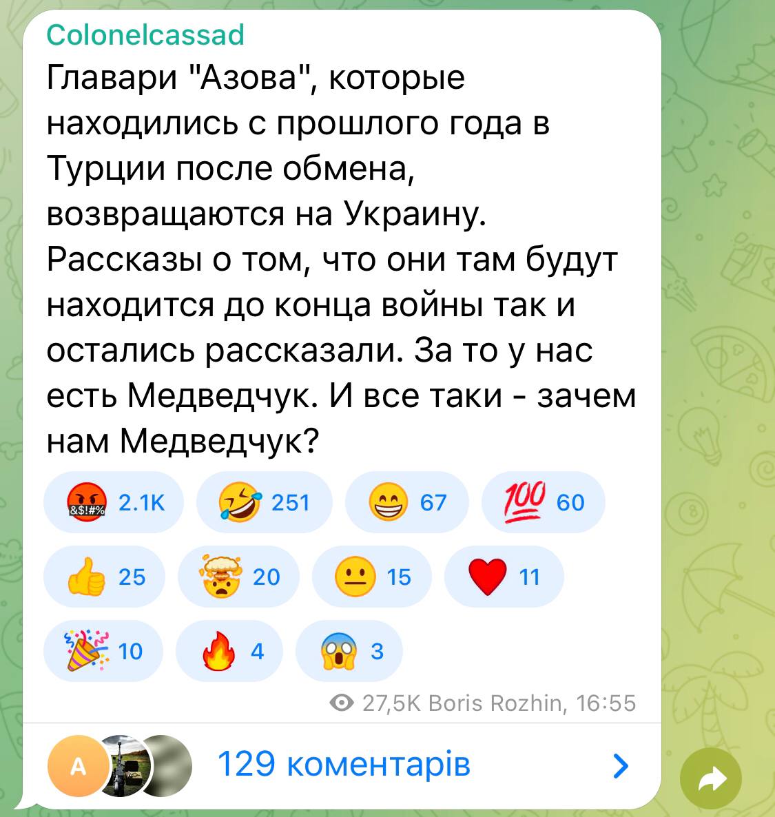 П'ятеро командирів-захисників Маріуполя Денис Прокопенко, Святослав Паламар, Сергій Волинський, Олег Хоменко та Денис Шлега повернулися додому з Туреччини, де вони перебували під своєрідним "домашнім арештом", і цей факт боляче вдарив по Z-патріотам.