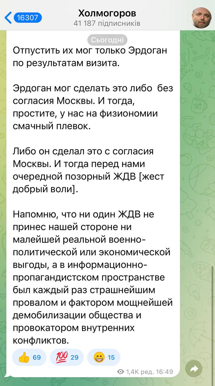 Ідеолог проекту "Новоросія" Єгор Холмогоров зауважив, що президент Туреччини міг відпустити додому українських бійців без згоди Москви, що є "смачним плювком" у російську фізіономію, або навпаки, відпустив їх за згодою Москви, яка виявила таким чином "жест доброї волі".