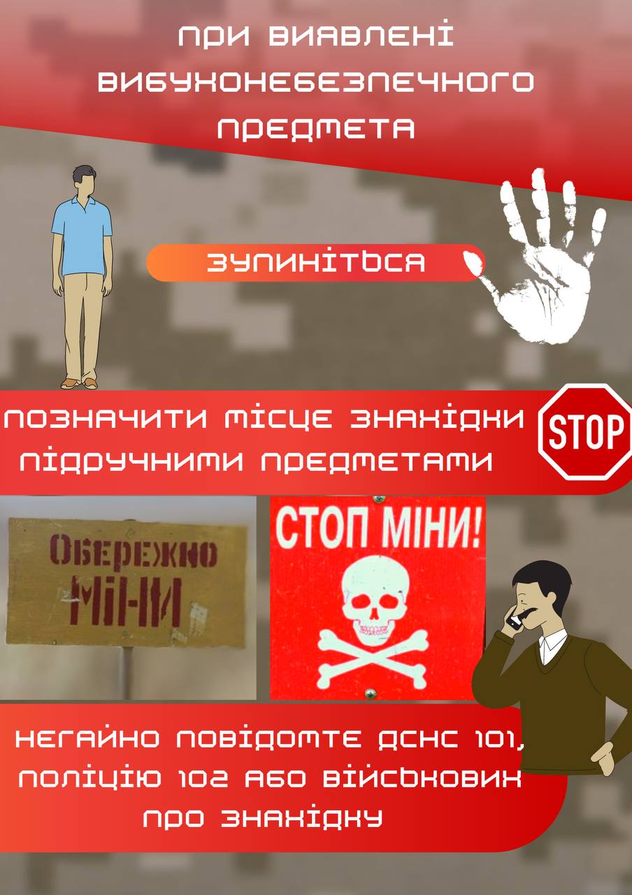- відійти тим самим шляхом, яким рухались на безпечну відстань та негайно викликати рятувальників 101, поліцію 102 або повідомити про знахідку військових.