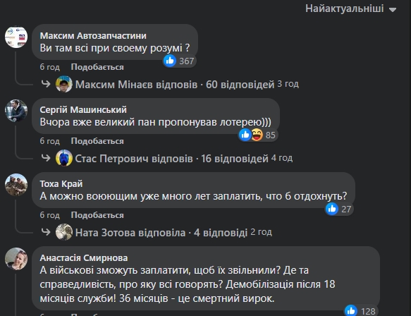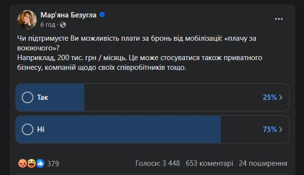 Заступник голови комітету Верховної Ради України з питань національної безпеки народний депутат від "Слуги народу" Мар'яна Безугла, після опитування про мобілізацію жінок, поцікавилася, чи підтримують українці ідею заплатити за бронь від мобілізації.