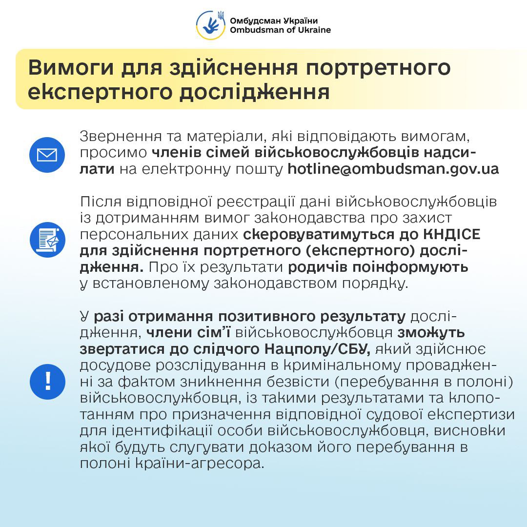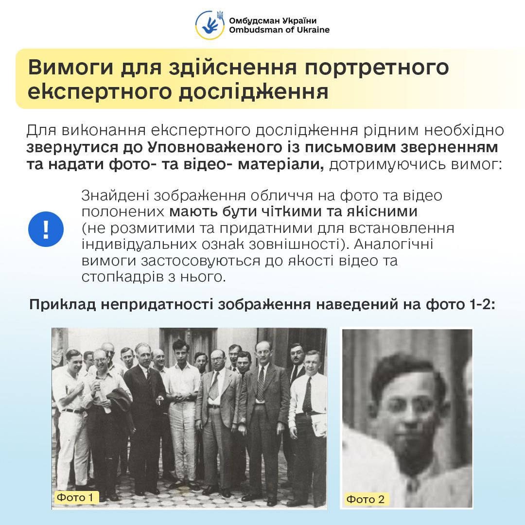 "Якщо рідні знайшли у соціальних мережах відео або фотоматеріали, на яких вони впізнали свого захисника, то можуть звертатися для подальшого скерування фото- та відеоматеріалів до КНДІСЕ з метою проведення експертного дослідження з ідентифікації військовополоненого за ознаками зовнішності", - написав омбудсман.