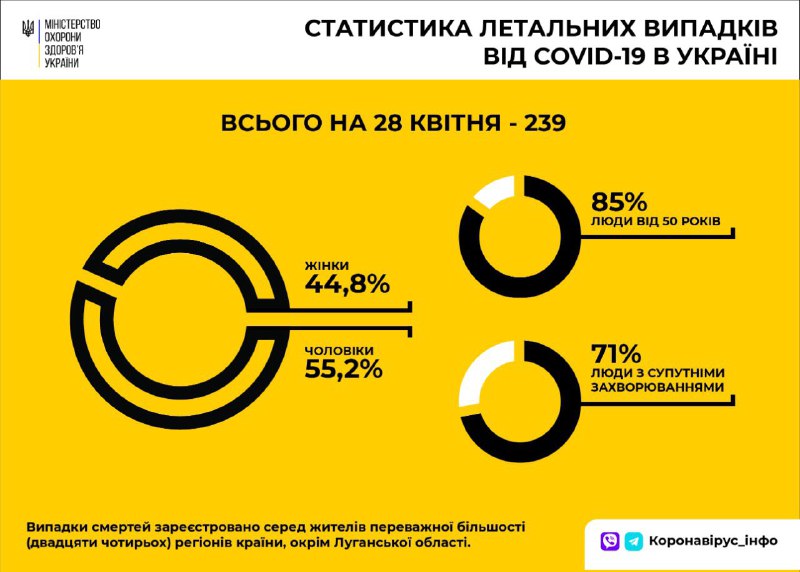 Відзначають, що з початку епідемії COVID-19 в Україні зафіксовано 239 летальних випадків у осіб, які хворіли коронавірусною інфекцією.