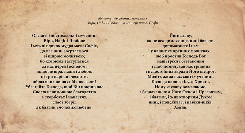 О, святі і достохвальні мучениці Віро, Надіє і Любове і мужніх дочок мудра мати Софіє, до вас нині звертаємося зі щирою молитвою; бо хто може заступатися за нас перед Господом, якщо не віра, надія і любов, ці три наріжні чесноти, образ яких ви на собі показали! Ублагайте Господа, щоб Він покрив нас Своєю невимовною благодаттю в скорботах і напастях, спас і зберіг як благий і чоловіколюбець. Його славу, як незаходиме сонце, нині бачачи, допомагайте і нам у наших смиренних молитвах, щоб простив Господь Бог наші гріхи і беззаконня і щоб помилував нас грішних і недостойних заради Його щедрот. Моліть же за нас, святі мучениці, Господа нашого Ісуса Христа, Йому ж славу возсилаємо, з безначальним Його Отцем і Пресвятим, і благим, і животворчим Духом нині, і повсякчас, і навіки-віків. Амінь.