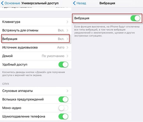 В смартфонах iPhone необхідно відкрити розділ налаштувань "Універсальний доступ", після чого посунути ліворуч елемент управління навпроти пункту "Вібрація".