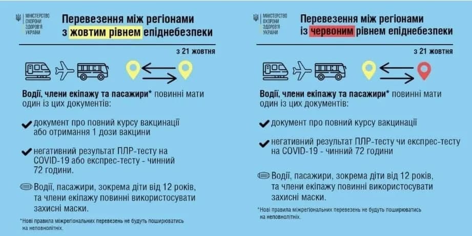 З сьогоднішнього дня, 21 жовтня, в Україні почали діяти нові правила перевезень пасажирів між областями. У регіонах з "жовтим" рівнем достатньо пред'явити документ про повний курс вакцинації або про отримання 1 дози, при в'їзді в "червоні" допустять тільки при повному курсі вакцинації.