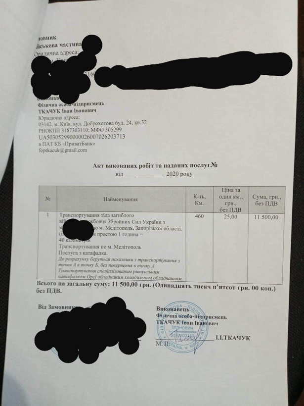 За словами журналістки, про цю схему їй розповів один з офіцерів ЗСУ, який зараз служить на Донбасі. Він же і надіслав документи, згідно з якими СПД, який надає ритуальні послуги, зареєстровано на якогось Ткачука І.І. з місцем реєстрації - гуртожиток.