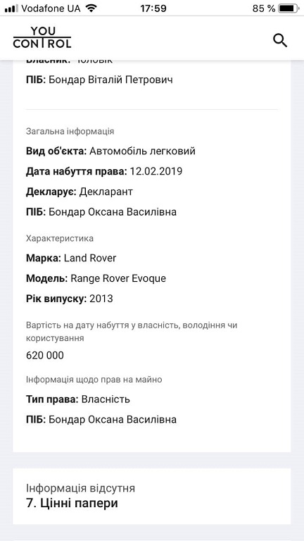 "Сам Бондар задекларував 2 ділянки в Києво-Святошинському районі за останні два роки. А дружина, київський прокурор, стала власницею Рендж Ровер", - зауважила Яніна Соколова.